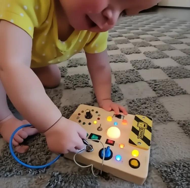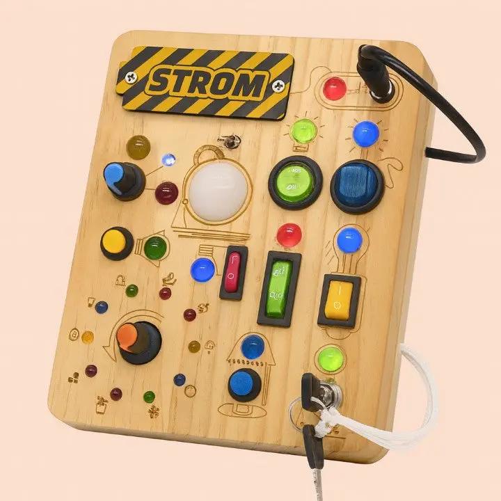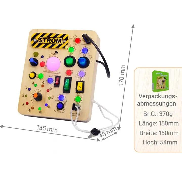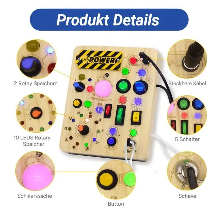 Dieses Aktivitätsbrett enthält 10 verschiedene Schalter und 23 leuchtende LED-Lampen, die echte Lichtsysteme nachahmen.